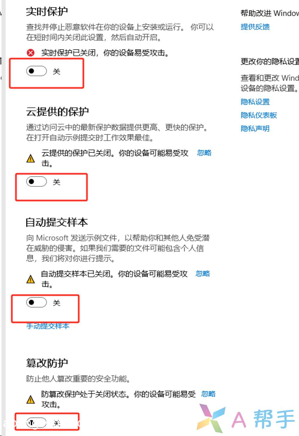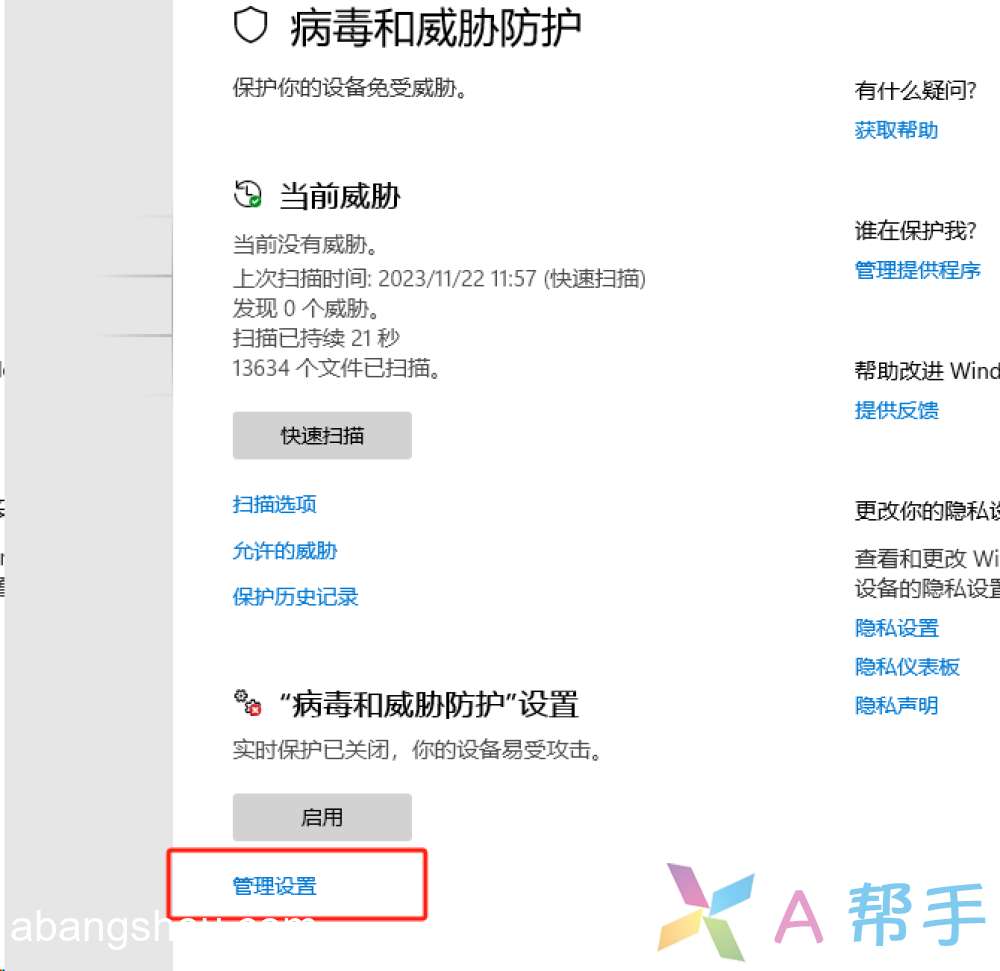 Windows11 关闭病毒和威胁防护“设置2023-11-22阅读:5331、开始菜单 -》设置 -》隐私和安全性 -》Windows 安全中心 2、打开安全中心或者点击病毒和威胁防护 3、点击管理设置 4、全部关闭