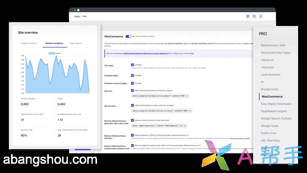 通过SEOPress Pro,用户可以管理其标题、元描述、元机器人、XML站点地图和社交媒体分享,包括Open Graph标签、Twitter Card和Google Knowledge Graph。该插件还与Google Analytics和GDPR兼容,使用户能够跟踪访问者、创建自定义维度、排除用户、启用重新营销等。