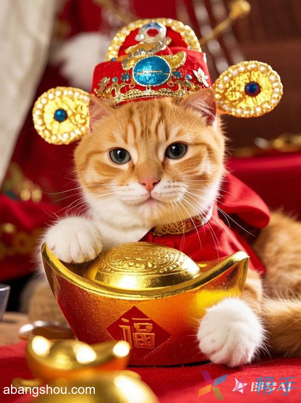 提示词:一只小橘猫,毛茸茸的,抱着大金元宝,戴财神帽,穿红礼服,给大家拜年。