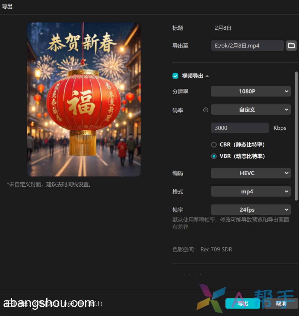 导出时,选择码率为自定义,设置为3000Kbps,帧率24fps,其它保持默认即可。