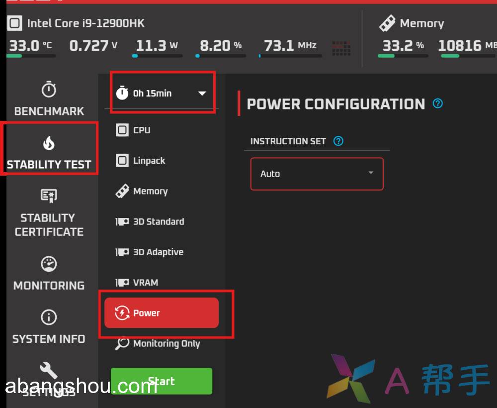 点击 TEST -> Power -> 时间15分钟 ->点击Start 开始测试