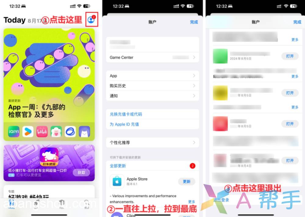 点击App Store进入后,然后点击右上角头像,划到最下面,点击退出登录