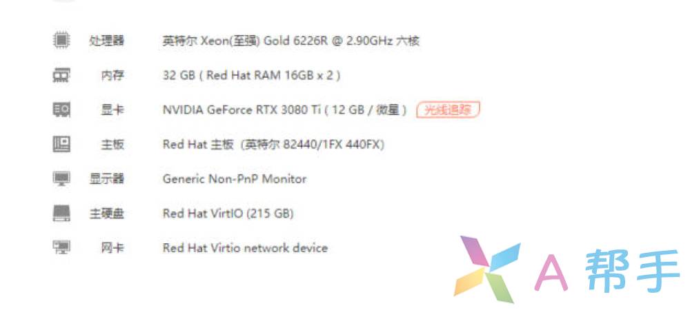 配置点评: 这套配置非常有趣。CPU使用的是英特尔至强金牌 6226R,这是一颗服务器级的处理器,主频高达 2.9GHz,虽然系统只分配了 6个核心 给这台虚拟机,但其单核性能依然强劲。最亮眼的莫过于那是来自微星(MSI)的 RTX 3080 Ti 12GB,这是目前第一梯队的顶级显卡,通过直通技术(Passthrough)赋能给虚拟机使用。