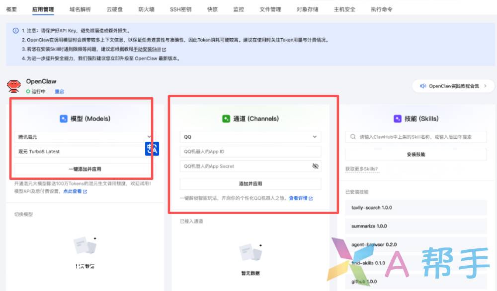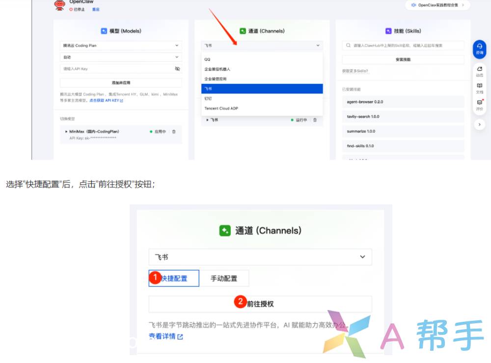 首先,进入腾讯轻量云Lighthouse应用管理页的配置面板,在“通道(Channels)”中选择“飞书”;