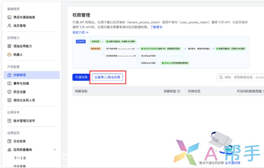在飞书应用管理页,左侧导航栏找到 “权限管理” ,点击进入页面。点击页面中的 “批量导入权限” 按钮,弹出权限导入窗口。