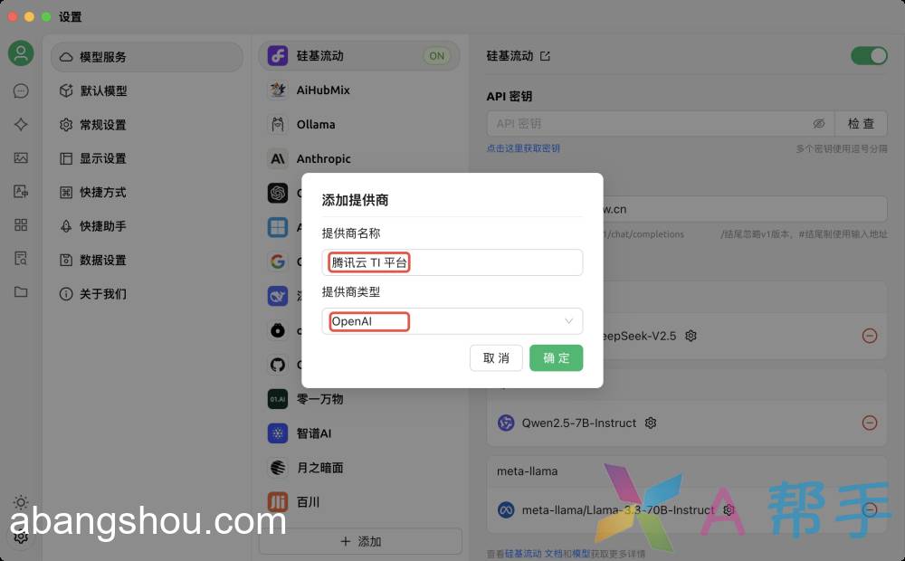 3、单击添加后,需要在弹出的“添加提供商”对话框中输入信息,其中,“提供商名称”可自由填写,提供商类型需选择“OpenAI”,填好后单击确定: