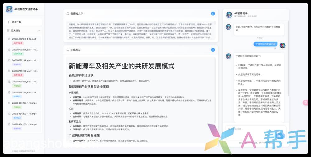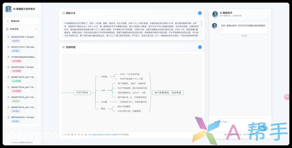 开源的自媒体 AI 视频图文创作神器:AI-Media2Doc2025-05-06阅读:331 功能特点: 完全开源, 支持本地部署, 无需登录注册, 任务记录保存在本地。 音视频纯前端处理方案, 使用(ffmpeg wasm), 无需本地安装 ffmpeg。 支持视频/音频文件, 支持输出多种风格的文档, 包括小红书/知识笔记/微信公众号和思维导图。 支持针对视频内容进行AI二次对话。 可基于视频内容二次对话 支持生成思维导图 生成的思维导图可以导出到第三方免费的平台进行编辑和调整