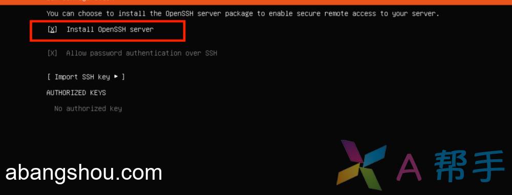 关键操作:勾选“Install OpenSSH server”,便于通过终端远程管理。